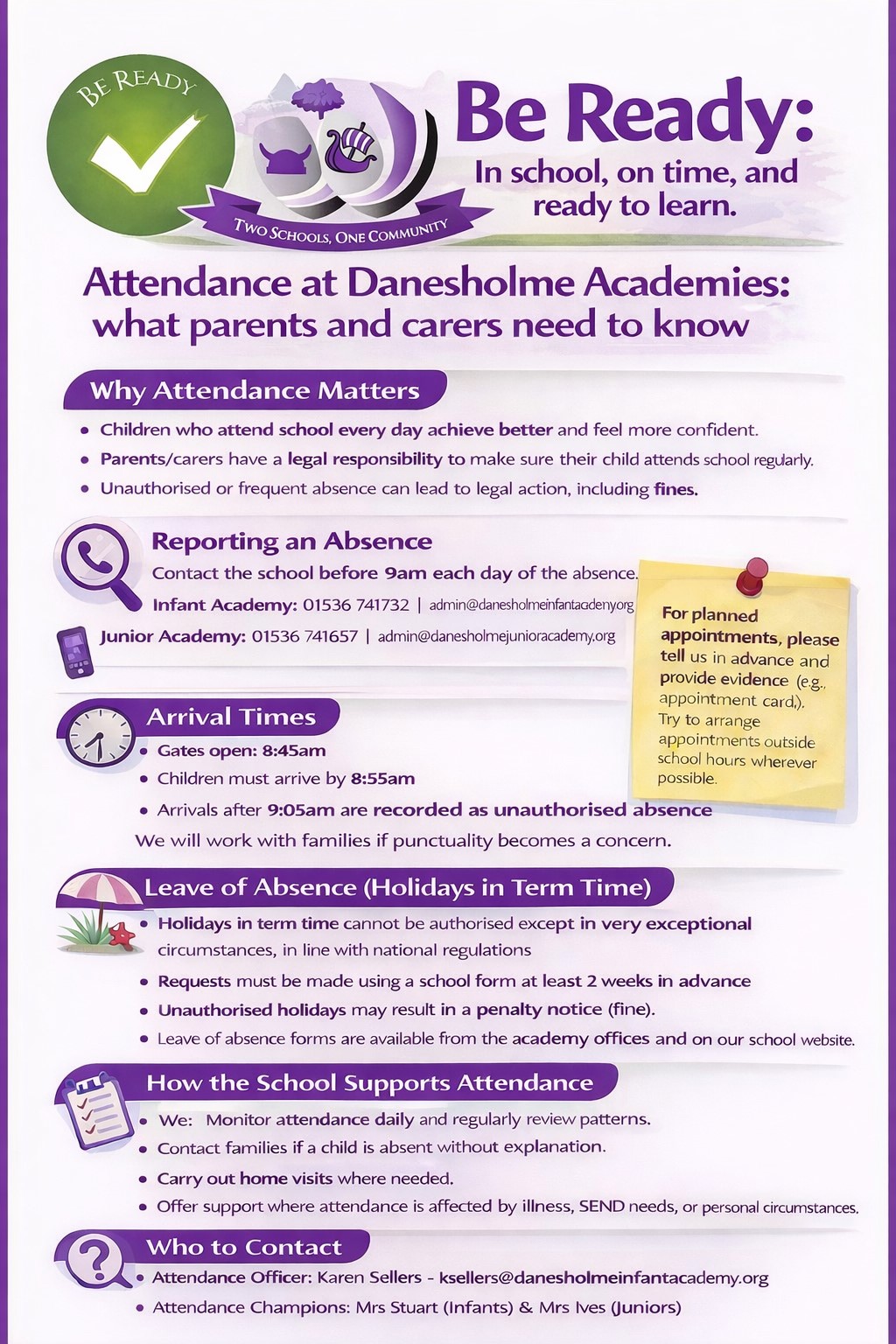 If your child is unable to attend school due to illness or unavoidable circumstances, please contact the Academy on each day of absence (before 9am) by calling and leaving a message on 01536 741657 or you can email admin@danesholmejunioracademy.org